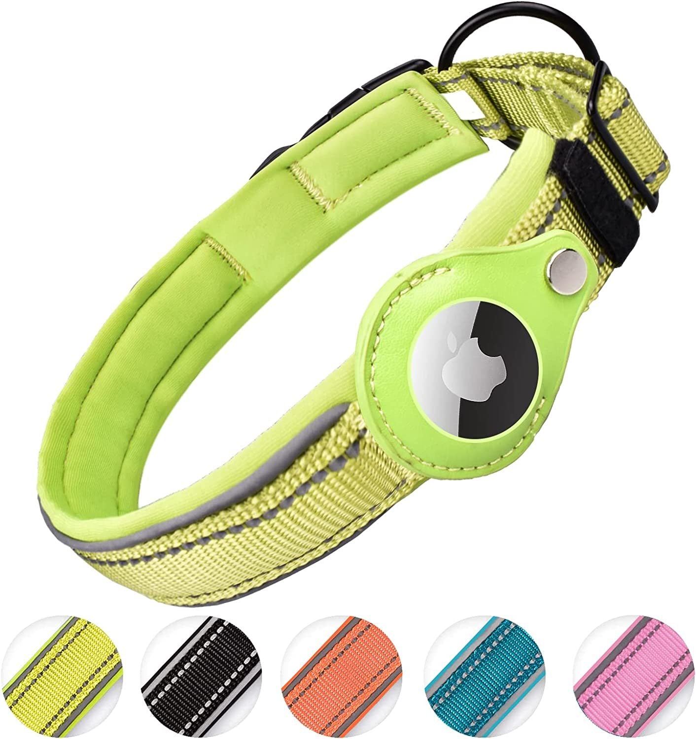 INTEGRATED DESIGN FOR AIRTAG: Are you always wondering where is your dogs or cats? Or are you always trying to find him/her? We're proud to announce our latest AirTag Dog Collar; integrated the AirTag Holder with premium basic Dog Collar. With our AirTag Dog Collar; allows you to keep tracking your beloved ones! (Note: The AirTag is not included) FIRM & COST EFFECTIVE: Bolting with the screw; the built-in leather pocket as Dog AirTag Holder is a perfectly fit and prevents your AirTag to lose or drop from it. 100% firmly combined with the Dog Collar; ensures your Apple AirTag stay connected with your dogs/cats. Plus; you won't need to purchase other detached; easily lost AirTag products. PREMIUM MATERIAL: Designed with premium material; reflective stripe; waterproof webbing and strict stitching ; our Air Tag Dog Collar is also featured with soft neoprene padding; prevent your dog's from any irritation or discomfort. No sharp edges or unfold sewing join; and sturdy premium plastic buckle and alloy D-ring ensures your dog's safety. PRODUCT FUNTIONS ENGINNERING: Our Air Tag Dog Collar is more convenient to release with the one-hand quick release buckle; and the D-ring provides a secure attachment for your dog leash and hanging accessories. The strong reflective stitching and edges make your dog's easier to be seen in darkness; safer for walking; running or jogging in the wild. MULTIPLE SIZE OPTIONS: The whole package includes: Airtag Dog Collar x1; Screwdriver x1. Our heavy duty Dog Collar comes with 4 colors and 4 sizes; perfect for small; medium and large dogs. Please measure your dog's neck before your purchase. S: 12"-14"; M: 15"-18"; L: 17"-20"; XL: 19"-22". (Neck Circumference in INCHES)